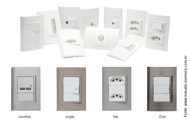 A linha “Vivace”, da Siemens, possui variedade de módulos (ou funções) e placas em cores sóbrias.