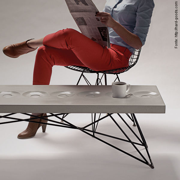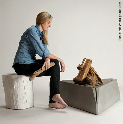 A lareira -mesa -plataforma “Triangulum” é um charme para ver o fogo crepitar. O banco parecendo uma tora de madeira também é feito em concret o pela norte americana Hard Goods. Mobiliário bonito, em concreto, é com a ( Hard Goods : após cinco anos de existência e com um know how no “fazer” um material fino, resistente e com acabamento realmente belo, a empresa exibe suas criações com muito orgulho, acertadamente.