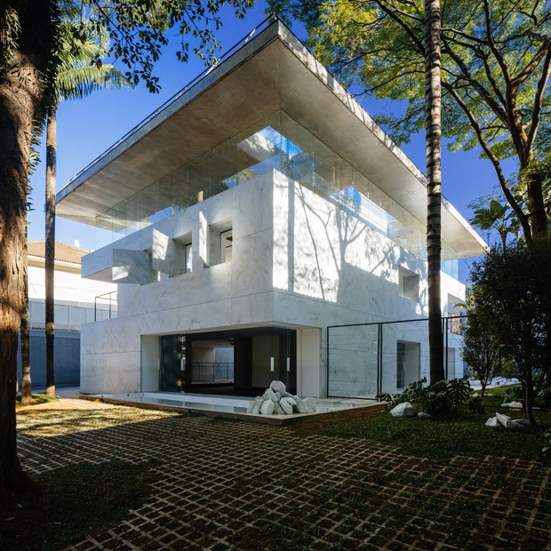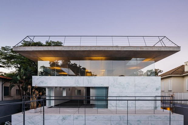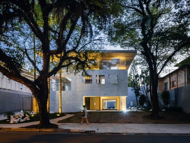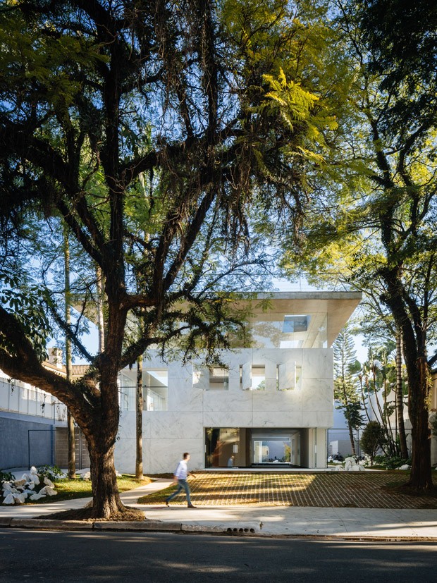 “O prédio é uma reflexão sobre a materialidade“, conta a sócia Carolina Bueno. Assim, as fachadas são cobertas por mármore branco. Logo acima, uma faixa de vidro parece sustentar a espessa cobertura do edifício. Pedra, vazio e concreto, rocha líquida, se misturam em uma composição que parece desrespeitar a gravidade.