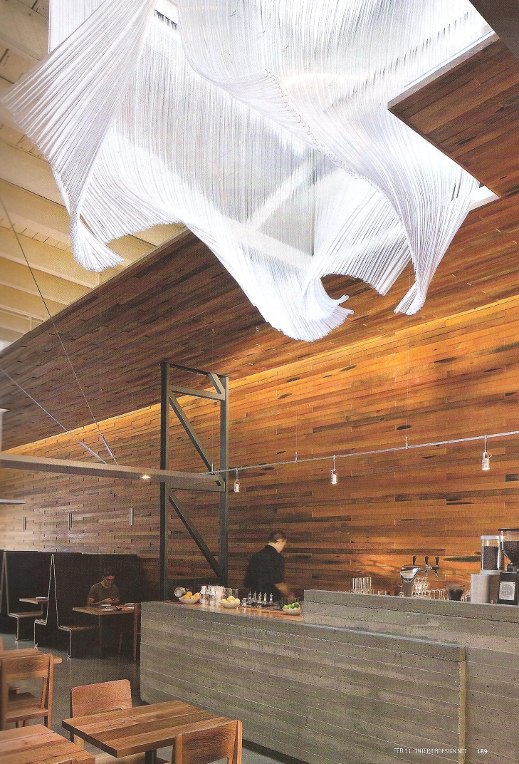 O projeto do Bar Agricole, junta elementos como madeira, revestimentos cimentícios, móveis cimentícios, em um ambiente rústico e agradável.