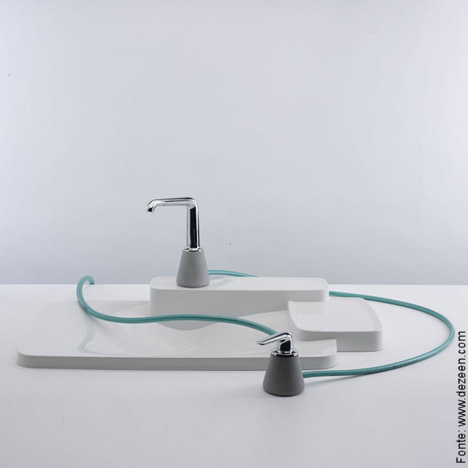 Felix Klingmüller usou concreto na base das peças e criou uma série de “mangueirinhas” que podem ser conectadas a pontos de água para que o usuário escolha onde quer colocar a torneira, o manete do misturador, entre outras possibilidades.