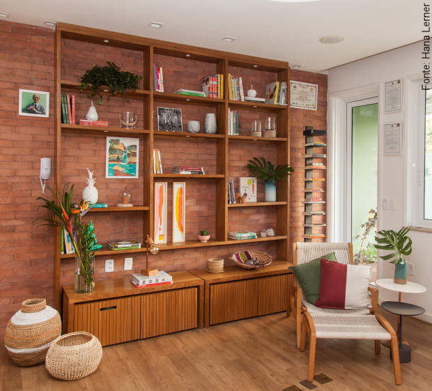 A cozinha é simples e integrada, funcional, espaçosa e acolhe uma longa bancada, sendo considerada o coração da casa, como não poderia deixar de ser. Mas a sala não fica atrás: a escolha pelos materiais traz aconchego ao ambiente que conta com uma grande estante de madeira. A antiga porta da varanda que divide o living do escritório foi mudada de lugar e lembra a fachada de uma casa. As cores foram um pedido da moradora que escolheu tonalidades inspirada em um sítio que visitou, segundo a arquiteta.