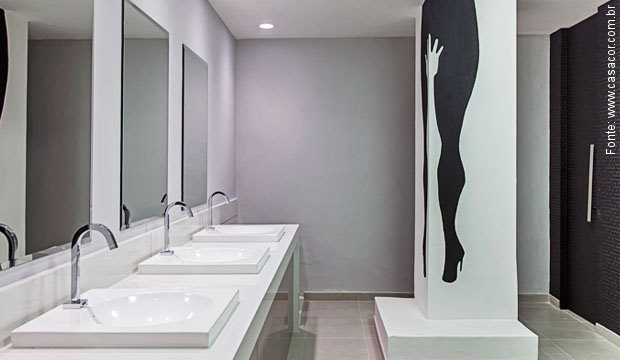 No “Lounge com Banheiro Unissex”, de Mariana Noronha e Samra Akad, uma parede em cinza escuro arremata um espaço que era para ser muito colorido. E também destacamos o belo e minimalista “Banheiro Feminino” de Sabrina Gikovate e Thais Reyes: suave e no contraste com o branco, este cinza traz calma ao espaço. E finalmente, damos como confirmada a tendência, é claro.