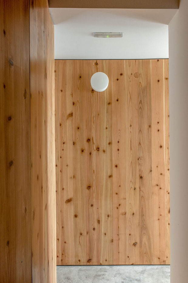No piso inferior foram alocados quatro quartos, todos eles com paredes forradas de madeira e piso cimentício. Subindo as escadas, chega-se ao andar superior onde há uma sala de estar. Nesse ambiente, o teto é inclinado, acompanhando a forma do telhado. Outro ponto focal deste espaço é a estante de madeira que cobre toda a parede triangular, envolvendo a porta-janela.