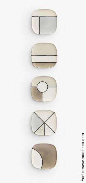 Formas geométricas retiradas de pratos de porcelana iguais – de cores diferentes – coladas umas às outras, com acabamento em preto são uma novidade da Nendo para este ano