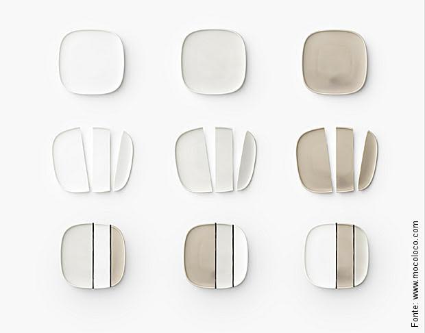 Mas esta “verve” criativa não para e, durante todo o ano, o pessoal de lá sempre mostra uma novidade. Isto foi o que ocorreu com a nova linha de louça – sim, eles mexem com tudo!- criada com base em uma tradição da região de Gifu, no Japão, que remonta a 1300 anos: a de dar acabamento em peças de porcelana e de cerâmica quebradas e novamente coladas com douração (folha de ouro). Você já deve ter visto isso por aí, e saiba que este tipo de peça se chama “Mino-yaki”. Mas a abordagem do Nendo foi diferente: de posse de alguns pratos de porcelana, os recortaram em determinadas formas geométricas e os uniram novamente com um tipo de cola laca em preto. Ao contrário de “valorizarem o conserto” com um fio dourado, eles utilizaram o preto como um contraponto à limpeza e clareza das peças antes da junção.