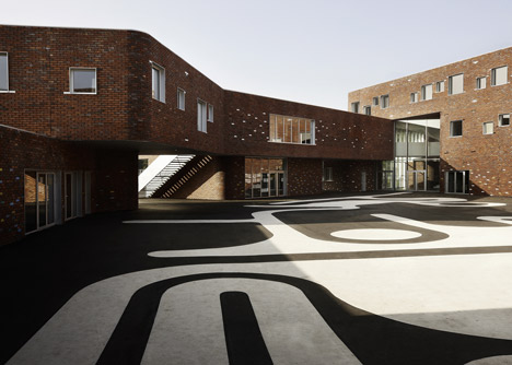 O alinhamento assimétrico das janelas de várias dimensões, trazem luz para as salas de aula e oferecem belas vistas da cidade aos alunos. Na parte sul da zona exterior…………………………………….