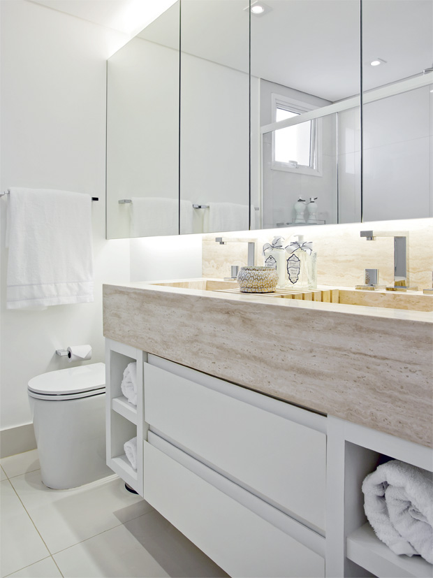 O uso de revestimentos claros dão uma sensação de espaço maior, ainda mais quando aliados a espelhos nas paredes. É importante pensar na uniformização de materiais, se escolher um tom de revestimento o use em todo o projeto, isso ajuda a dar impressão de que o banheiro é um pouco maior do que realmente é.