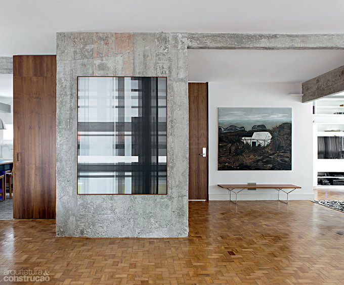 Encontrar uma coluna toda em concreto na hora da reforma da casa ou apartamento tem sido quase como “acertar na loteria”. E quando ela tem grandes dimensões como a da imagem, melhor ainda! Neste caso um espelho foi aposto sobre a mesma o que só deu mais charme à composição.