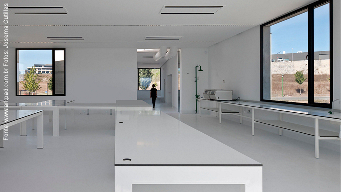 Duas caixas flutuantes em concreto: é este o resumo do que se pode dizer, do ponto de vista arquitetônico, sobre o projeto dos espanhóis Javier Pérez Herreras e Javier Quintana De Uña para os laboratórios Biokilab, localizado na pequena cidade de Álava, no norte da Espanha. Os profissionais do escritório Taller Básico criaram espaços retos, de apenas um andar, apoiados sobre uma estrutura metálica de aparência delicada e colorida que, sob alguns pontos de vista, desaparece, deixando as “caixas” que abrigam o laboratório, “flutuando no ar”.