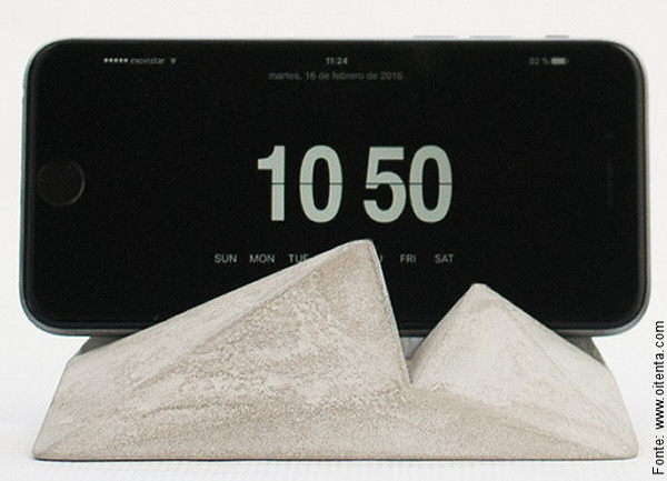 E para acabar com novidade, a base para smartphones e tablets do estúdio Montelouro é perfeita para quem curte os contrastes hi-low, ou seja: o “hi(gh)” da tecnologia de ponta e o “low” do concreto. O design permite o uso em diferentes posições, que se adequam a diversos tamanhos de equipamentos. Inspirado na geometria das pirâmides e origamis, segundo os designers, é para se usar na sala, no quarto, na cozinha, onde quiser!
