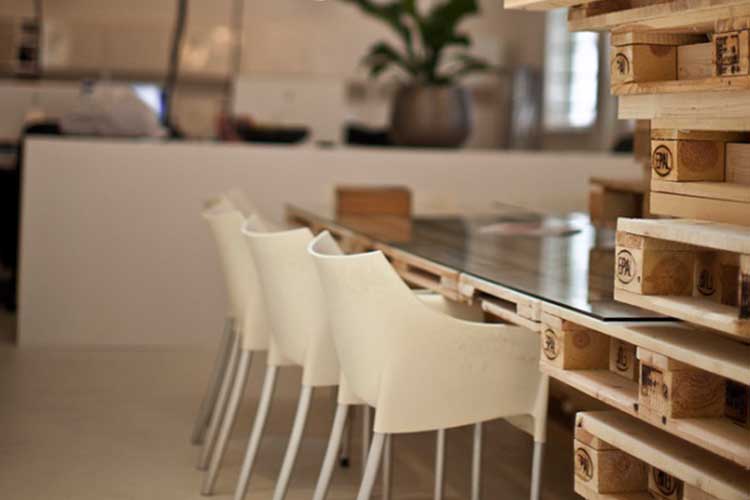 Projetado pelo escritório MOST Architecture, o Brandbase Pallet, possui 3 pavimentos onde se localizam as salas, estações de trabalho e sala de reunião. Todo o ambiente foi pintado na cor branca para que o efeito da decoração sobressaísse. Com pallets empilhados foi possível fazer mesas pequenas e compridas, e até uma escada de acesso aos dois pavimentos superiores. Os únicos elementos que precisaram ser acrescentados foram os vidros das mesas e o corrimão metálico da escada. Mesmo as mesas brancas do pavimento térreo, utilizam o pallet para apoiar objetos.