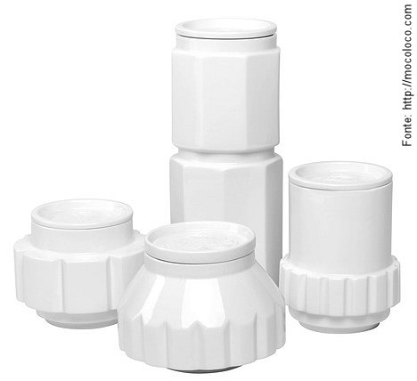 Potes em louça também com formas que lembram uma oficina.