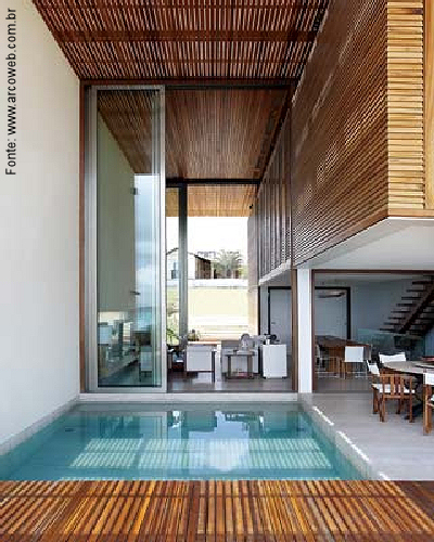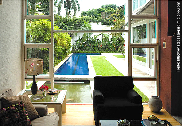 Os espelhos d´água que rodeiam mansões mas que também são utilizados como piscinas são uma boa opção quando se o terreno tem espaço exíguo. Fazer uma festa literalmente à beira da piscina e em espaço coberto se torna fácil – sem esquecer que você pode também entrar na mesma vindo de diversos pontos da casa. Realmente uma beleza de ideia.
