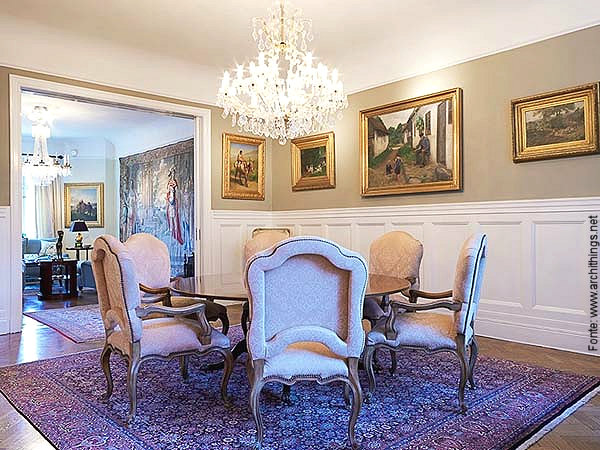 Trabalho em madeira em meia parede - a conhecida "boiserie", quadros com molduras trabalhadas, tapete oriental, cadeiras de estilo e um lindo pendente em cristal: um ambiente clássico por excelência!