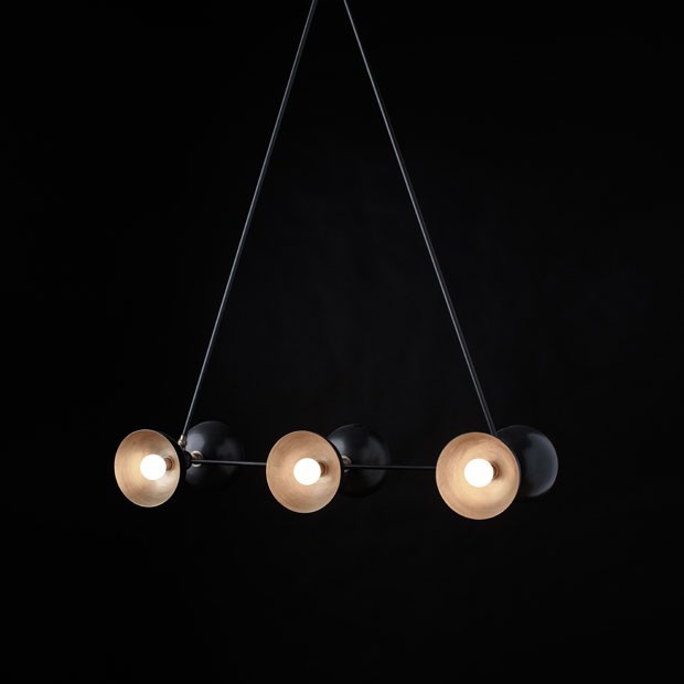 Os objetos envolvem geometria e desafiam as leis da física, já que exploram conceitos da gravidade. “Queremos passar a sensação de que os lustres são literalmente puxados para baixo”, diz o diretor criativo Gabriel Hendifar. A solução foi dar estabilidade aos pendentes que ganharam ar retrô e acabamento singular.