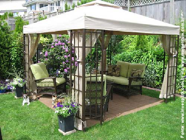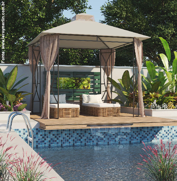 De armação de metal com cortinas, o leve gazebo apoia a quem quer curtir o jardim e a piscina com o conforto do mobiliário para área externa – também em metal. Note o conforto de todos os itens e a amplitude que se tem ao contar com uma cobertura para o sol do tipo.