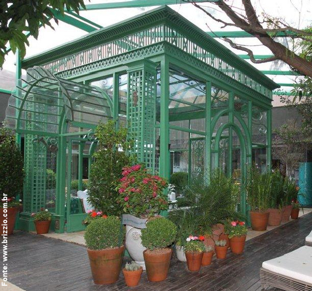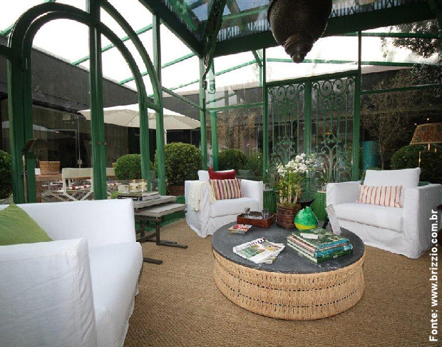 Esse é o exemplo de um gazebo para estações frias: também feito em estrutura metálica, é todo vedado com vidros e lá dentro há aquecimento ou uma lareira a gás ou a lenha. A foto do interior (abaixo), deixa ver o charme do mobiliário, o tapete no piso e todo o conforto programado para este lugar tão especial feito para observar a natureza também em localidades mais frias ou em estações onde a neve cai e há sol.