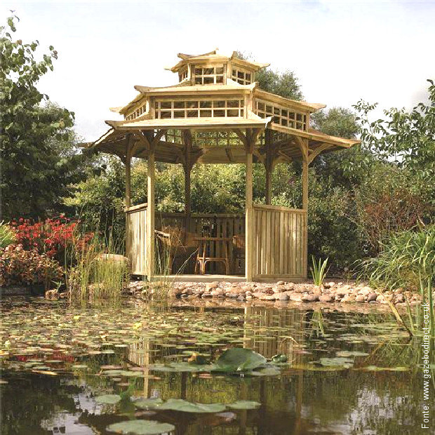 Um típico gazebo muito encontrado em parques e jardins públicos, todo feito em madeira e inspirado na forma de um pagode chinês: sempre deixa um belo impacto visual à beira de lagos e cursos d´água. Em formato hexagonal tem design intrincado cheio de volutas e trabalhos de marcenaria e carpintaria orientalizantes. Pode conter alguns móveis em seu interior.