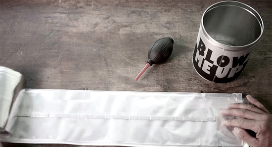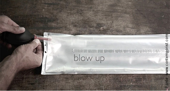 O designer Theo Möller e a equipe de Ingo Maurer andam se divertindo com as possibilidades do LED. Uma de suas últimas criações foi a luminária inflável “Blow Me Up“. Trata-se apenas e tão somente de uma espécie de balão em formato de antiga luminária para lâmpada fluorescente tubular que vem em uma lata, toda enrolada. Tudo o que você tem a fazer é enchê-la, como um balão de ar, e conectar sensores de eletricidade ao fio de LED que vem dentro dela. No mais é pendurá-la com o auxílio de ganchos e cordas ou fixá-la na parede e voliá: sua luminária está pronta para uso.