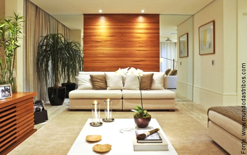 Um belo exemplo de grande efeito visual: centralizado na parede atrás do sofá e guarnecido por dois espelhos, o painel fica especialmente destacado e dá um ótimo background para o sofá revestido em cor clara.