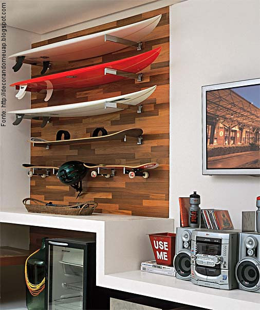 Espaços delimitados em paredes também ficam ótimos se revestidos com um material de tom forte e diferente do restante da parede como a madeira: neste caso, o painel serve para expor e guardar pranchas de surf e recebe mãos francesas grandes o suficiente para aguentar o tamanho e o peso dos objetos. Em uma situação como esta, o material cimentício é ainda mais indicado que a madeira em si.