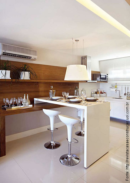 Cozinhas são espaços onde a praticidade do cimentício é valorizada: utilizar um painel com aspecto de madeira só valoriza mais o espaço que tem sido a cada dia mais aberto aos visitantes da casa. No exemplo, foi feito um belo destaque na área de refeições.
