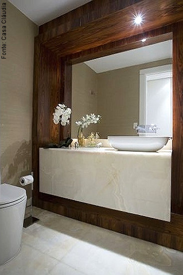 Ultimamente, lavabos e banheiros têm sido destacados também através do uso da madeira. Neste exemplo, a área do lavatório é praticamente fechada como um gabinete e revestida em pedra e madeira. Sendo utilizado um cimentício no padrão, tanto a execução quanto a manutenção ficam facilitadas devido às suas dimensões e resistência.