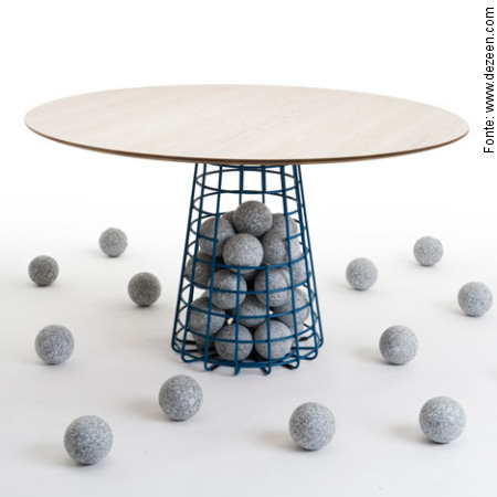 Benjamin Hubert criou para a marca portuguesa De La Espada esta mesa-pedestal onde esferas de granito dão peso à base em aramado de metal.