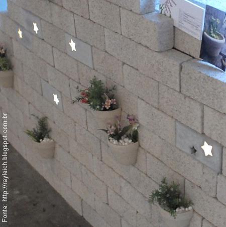 Um interessante bloco em concreto tem formas recortadas para a passagem de luz embutida na peça. Neste caso a forma foi uma estrela, mas poderia ser qualquer uma, desde que esteja em proporção suficiente para acomodar um ponto de luz. Repare que também pequenas floreiras em cimento estão agregadas à parede.