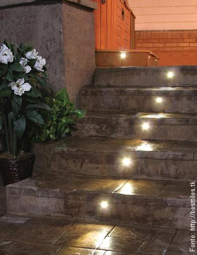 Já nesta escada, o revestimento em concreto possui um recorte redondo para deixar passar a luz embutida nos degraus. Na verdade trata-se de uma luminária feita com poliuretano que recebe um super LED para bem iluminar espaços externos.