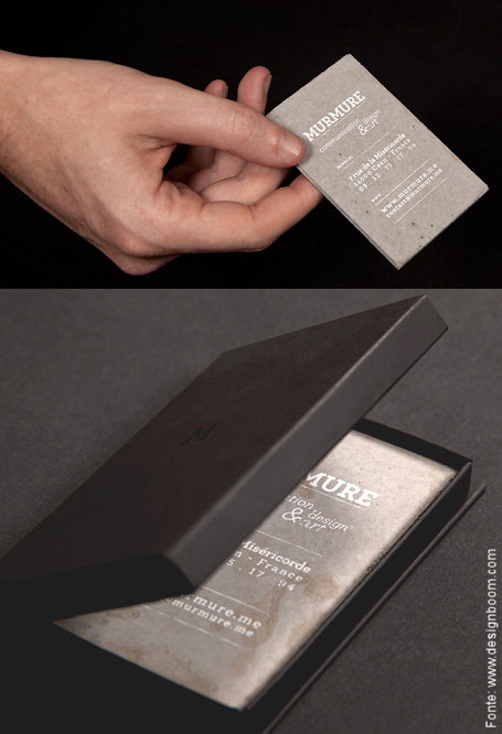 O estúdio de design francês “Murmure” criou seus próprios cartões de visita no material. Segundo eles foi uma brincadeira tanto com a noção de escala quanto do refinamento que o item exige. Cuidados com a impressão e a tipografia escolhida também foram bastante estudadas para que o resultado fosse elegante e sofisticado.