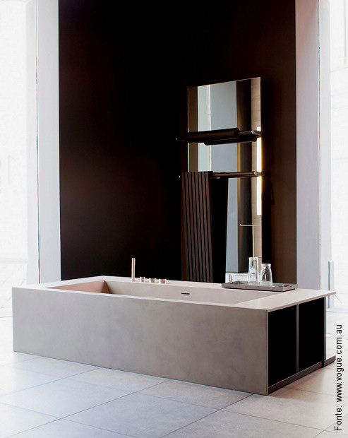 A belíssima banheira “Swim C“, desenhada por Piero Lissoni para a italiana Boffi, tem um novo acabamento em concreto, o que a torna objeto do desejo de dez entre dez profissionais ou leigos que gostam do minimalismo e da onda “simples” trazida pelo material.