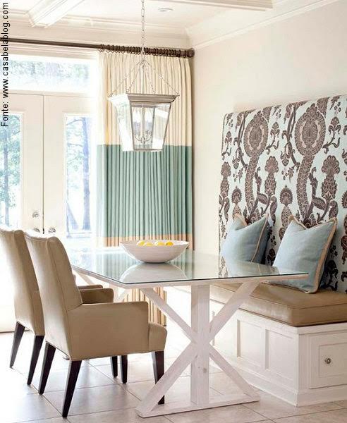 Com um ar um tanto sofisticado e bastante clássico, a opção foi a de usar boas cadeiras acompanhadas por um banco com encosto algo, fixado à parede e revestido com tecido para dar maior charme ao espaço de refeições.