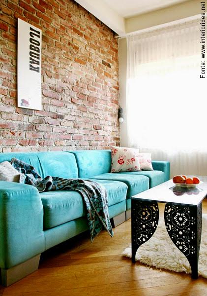 Aqui o tijolo rústico mostra toda sua beleza junto a uma cor agradável e super desejada como o turquesa do tecido do sofá. Simples e com muito bom gosto, o espaço recebe e acolhe com originalidade e bom gosto.