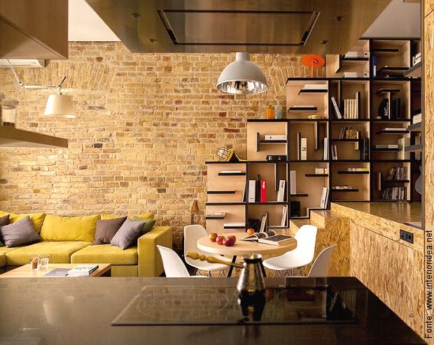 Contemporânea, leve e muito acolhedora, a sala combina tijolinhos em tom amarelado com OSB (um tipo de painel de madeira) na outra parede. Repare nos móveis e na luminosidade existente, que só valorizam o “pano de fundo”.
