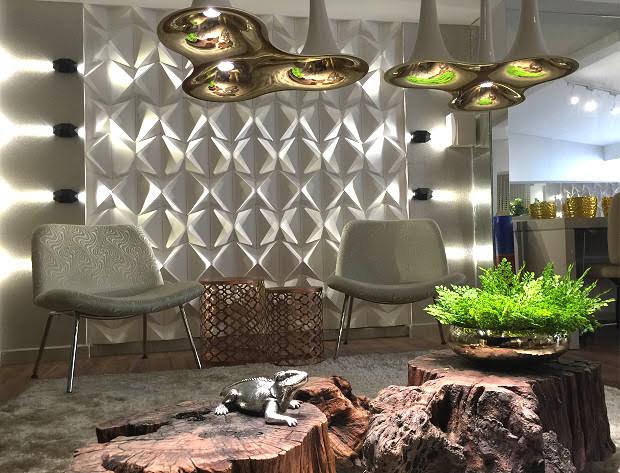 Com um aspecto moderno e techno sem esquecer o toque regional através do uso de uma mesa de centro feita com uma tora de madeira, por exemplo, o ambiente conquista por seus contrastes e boas escolhas: poltronas confortáveis, revestimentos naturais e complementos os mais bonitos, fazem do espaço de Rose Vaz um ponto alto da mostra.