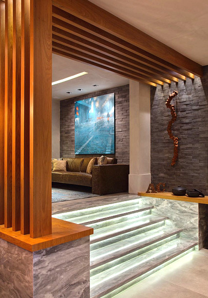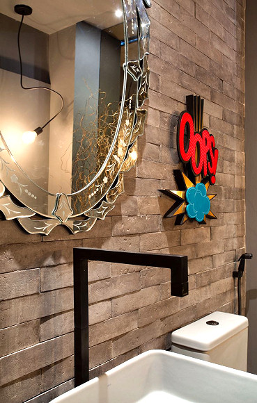 Obviamente que de todos os espaços de uma mostra, os de passagem obrigatória sempre são bastante comentados, e por isso mesmo Alexandre Cardim foi impecável em sua “Bilheteria e Lounge de Entrada” na Casa Cor© Espírito Santo deste ano. O lugar se divide em dois níveis que são um verdadeiro ponto de encontro para todos os visitantes. O piso é o mesmo: um porcelanato que integra os ambientes e que remete ao cimento queimado. Nas paredes nosso produto “Brique Lisser” na cor “Carvão” deixa tudo muito chic e com o glamour da noite que dá o tom ao local, complementado por textura que vai até o teto, tudo com uma iluminação para lá de bem cuidada.