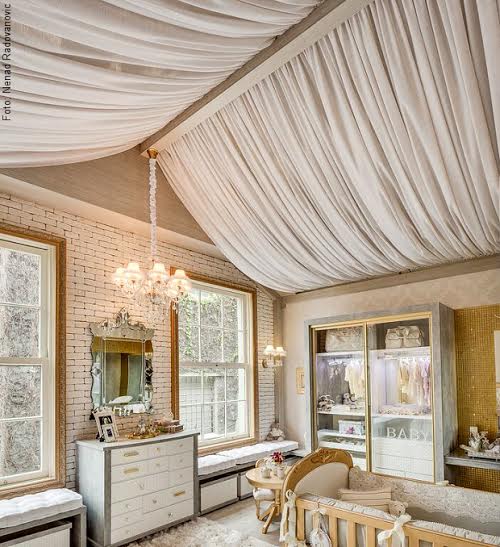 O espaço possui diversos componentes refinados, tais como tapetes fofíssimos, luminárias delicadas, molduras trabalhadas, além de um belíssimo espelho veneziano, entre diversos outros itens da linguagem mais tradicional. É bom destacar que a utilização do dourado – em detalhes, revestimentos e mobiliário – e de diversos tecidos franzidos, plissados, em capitonê, etc., também acentuam o ar elegante do belo quarto, com destaque para o teto revestido em tecido – que traz ainda mais charme ao lugar.
