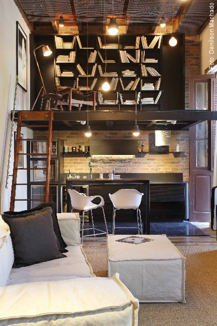 Cozinha integrada ao estar e mezanino com livros: ambiente masculino de Caco Borges na Casa Cor Rio© 2012.