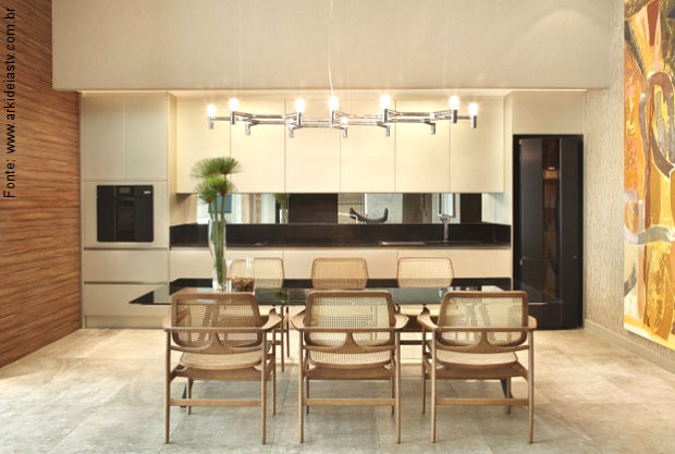 A belíssima sala de jantar, com cadeiras “Oscar”, mesa laqueada em preto e ótimos revestimentos.