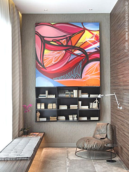 Detalhe do canto de leitura, com direito a uma bela (e colorida) obra de arte, e mini estante.