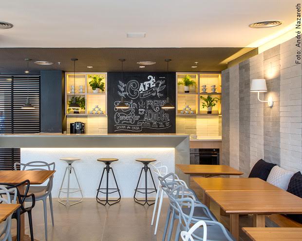 Nosso “Brique Lisser” em tons de branco e cinza compondo a parede lateral direita do café.