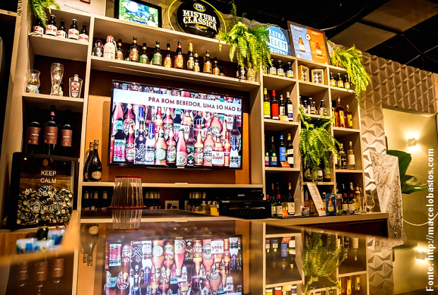 O piso frio cerâmico em tom de ferrugem foi uma boa escolha para manter a limpeza e o bom aspecto do espaço. Em uma escolha acertada e ousada, as mesas e cadeiras em branco deram destaque à iluminação focada e “abriram”, por assim dizer, a luz do ambiente, o que só valorizou o espaço. Uma imensa variedade de cervejas distribuídas por duas geladeiras e uma estante alta em madeira clara – além de algumas baixas, no meio do salão – faziam a felicidade de qualquer aficionado, prometendo muitas horas de degustação variada. Um telão da melhor qualidade garante o entretenimento caso falte alguma coisa – ou haja evento televisivo.