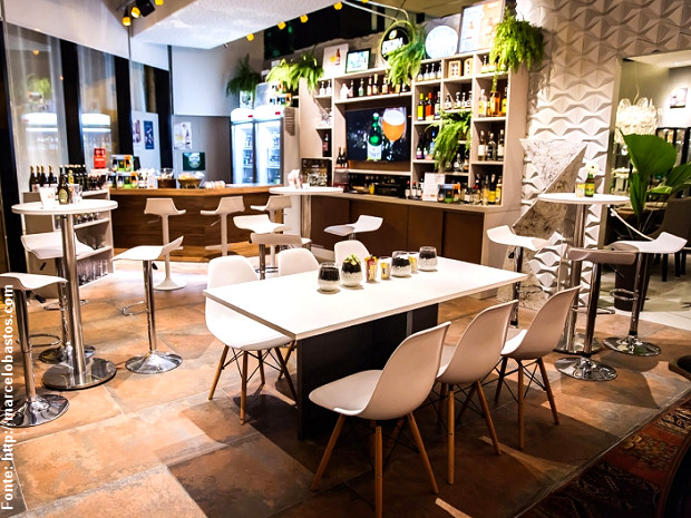 Eleitas como pedra de toque de todo o projeto, as garrafas foram utilizadas para fazerem muitos elementos do espaço: dos divertidos spots direcionais no teto a vasinhos e porta trecos para as mesas, além de enfeites diversos. As tampinhas também compuseram painéis em tampos de balcões e mesas, formando mosaicos bastante interessantes, dentro da temática de bar cervejaria. Enfim, um espaço confortável, de encontro e celebração, dos mais agradáveis.