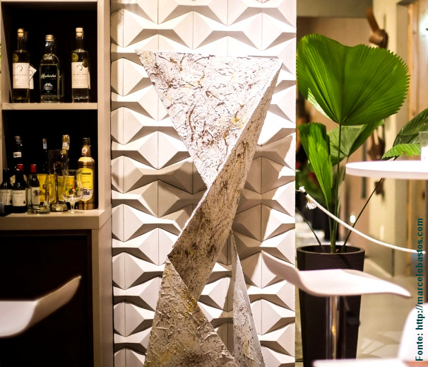 Nas poucas paredes restantes, além do blindex que separava o lugar do exterior, brilhou o design e o relevo de nosso “Cairo“, de nossa linha “Gauss“, na cor “Cinza“, de modo a trazer um pouco de textura ao ambiente. A escolha revelou-se bastante adequada visto que a peça trouxe o equilíbrio que faltava ao lugar sem excessos nem faltas.