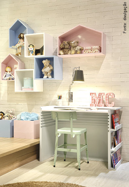 Ciça pegou firme nas cores claras e nos tons pasteis: tendo brancos e off whites como base, usou madeira clara, e completou com cor de rosa, verde e azul clarinhos. No papel de parede, passarinhos, para que nada seja mais leve. As formas dos módulos em forma de casinha (para guardar brinquedos e livros) e as cadeirinhas para se sentar, todas pequenas, leves e arredondadas, para crianças, pois elas são as donas do espaço. Um piso também em madeira claríssima e – com muito orgulho – nosso “Brique Lisser” na cor “Neve” nas paredes, completam o espaço, que quase flutua de tão belo e claro. Aliás, a iluminação é bem sutil, de modo a não interferir no visual geral. Quer mais delicadeza? Difícil, não é? Parece que tudo foi pensado para que a pequena sonhadora possa viajar no mundo da fantasia com toda segurança e certeza de que o mundo, apesar de tudo, ainda pode ser seu.