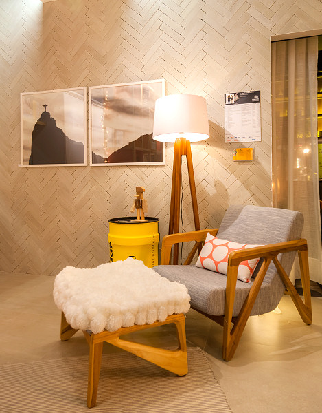 Em primeiro plano a poltrona de amamentar e nas paredes, nosso “Brique Lisser” colocado de forma criativa nas paredes.