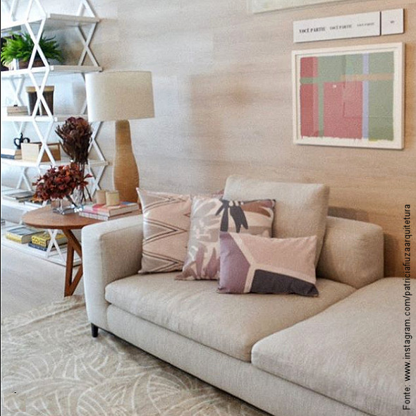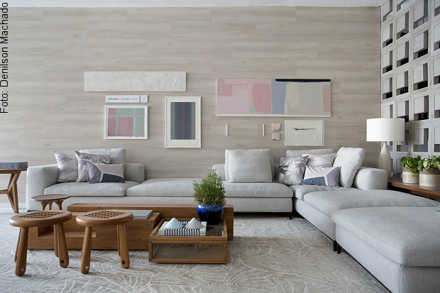 Cores claras levam ao aconchego sofisticado. Ao fundo, destaque para a divisória em cobogó “Itacoa“.