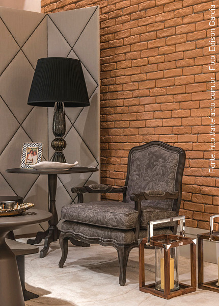 Só um detalhe do estar com móveis elegantes em estilo bem europeu e o nosso “Brique” na parede lateral.